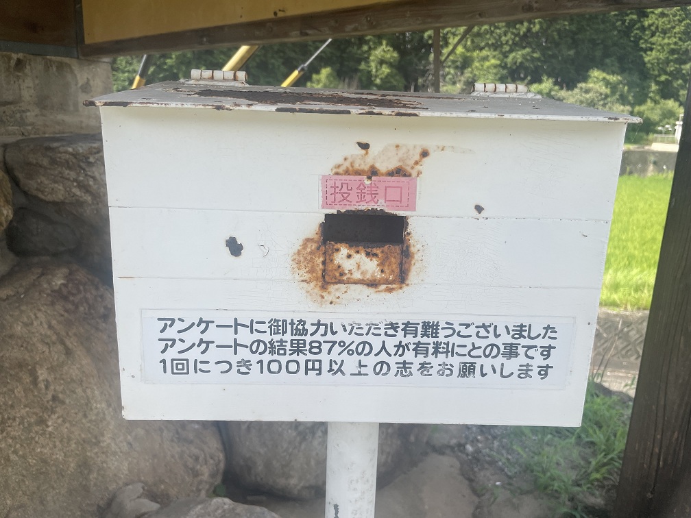 【雲母温泉 雲母共同浴場】蛇口から小さな浴槽に温泉が注がれる